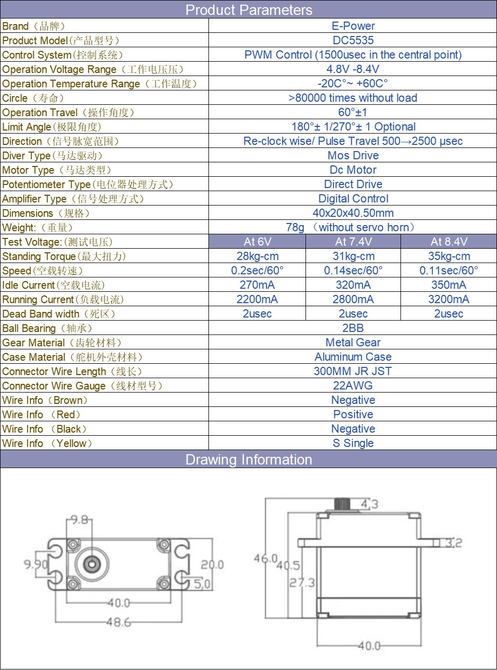 Standing Torque: 0.2sec/60°,28kg-cm-@6V ;0.14sec/60°,31kg-cm-@7.4V ;0.11sec/60°,35kg-cm-@8.4V