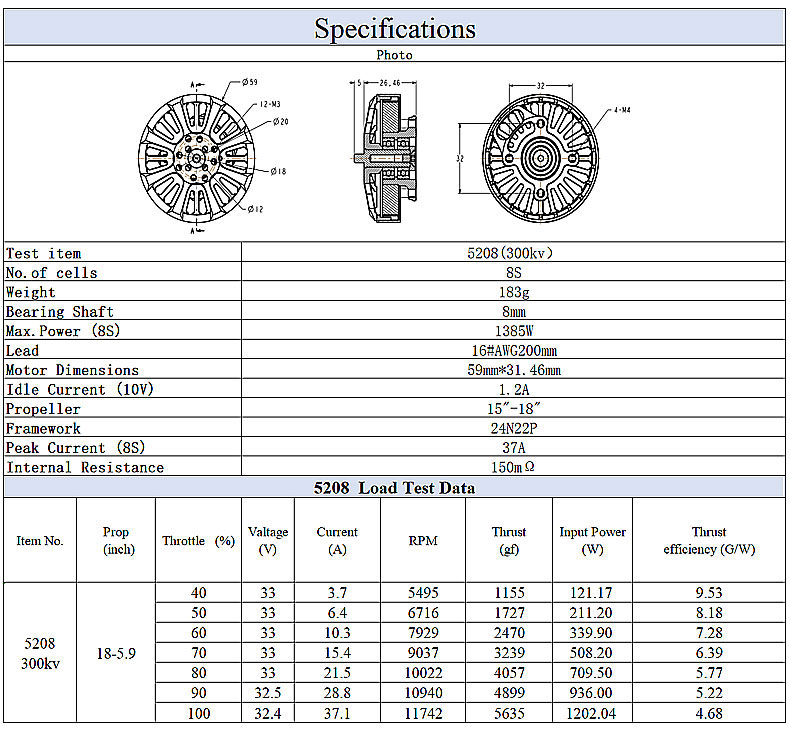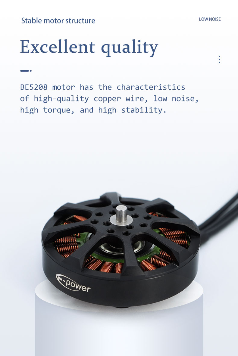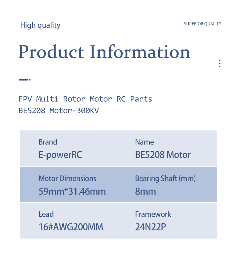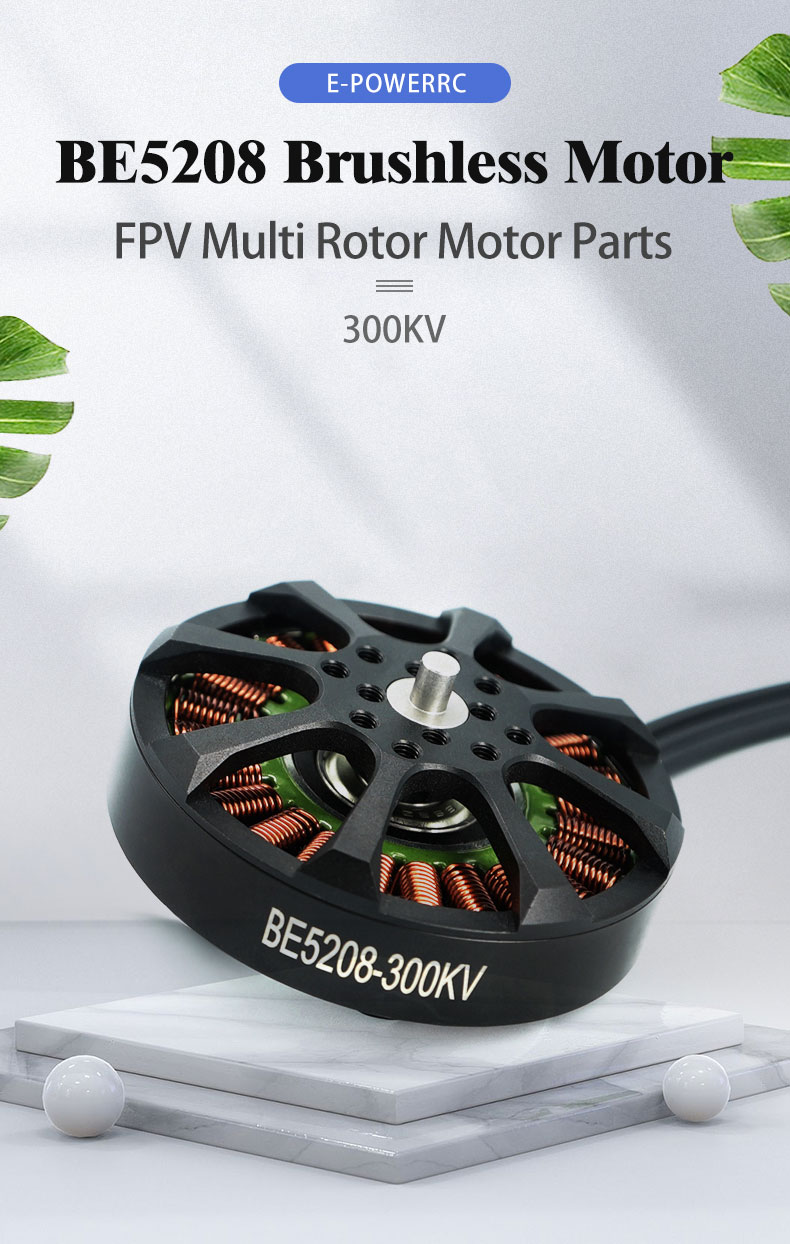 E-PowerRC BE5208 5208 300KV Brushless Motor 8S 15-18inch FPV Long Range Drone DlYPart-New Launch Large FPV Motor Parts item:BE5208(300KV) No.of cells: 8S Weight:183g W/0 Silicone Wire Bearing Shaft:8mm Max.Power (8S):1385W Lead:16#AWG200mm Motor Dimensions:59mm*31.46mm Idle Current (10V):1.2A Propeller:15"-18" Framework:24N22P Peak Current (8S):37A