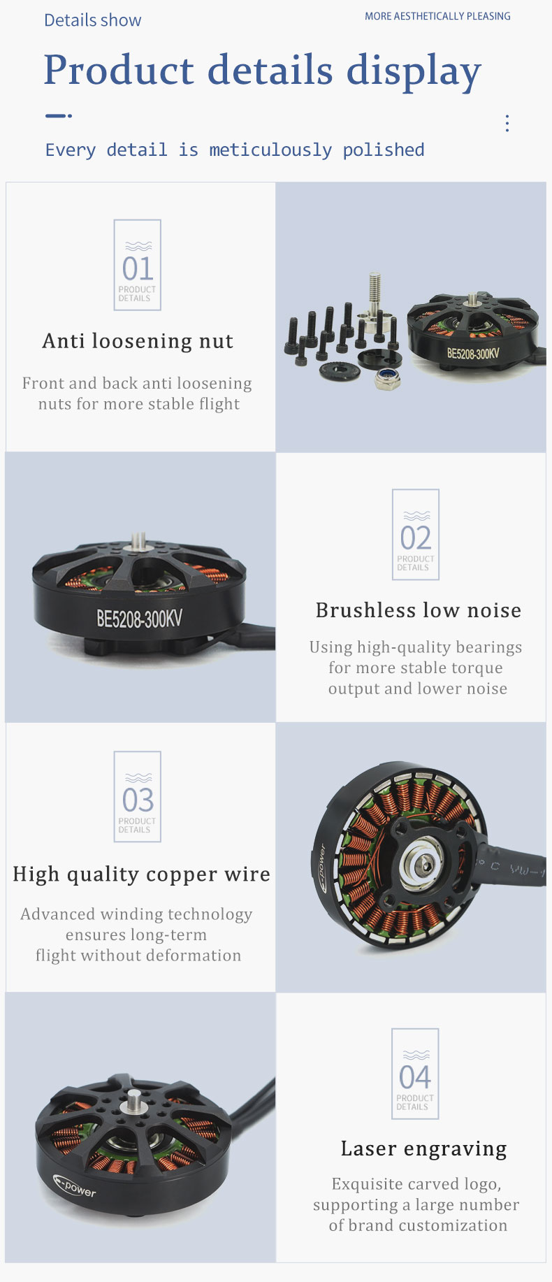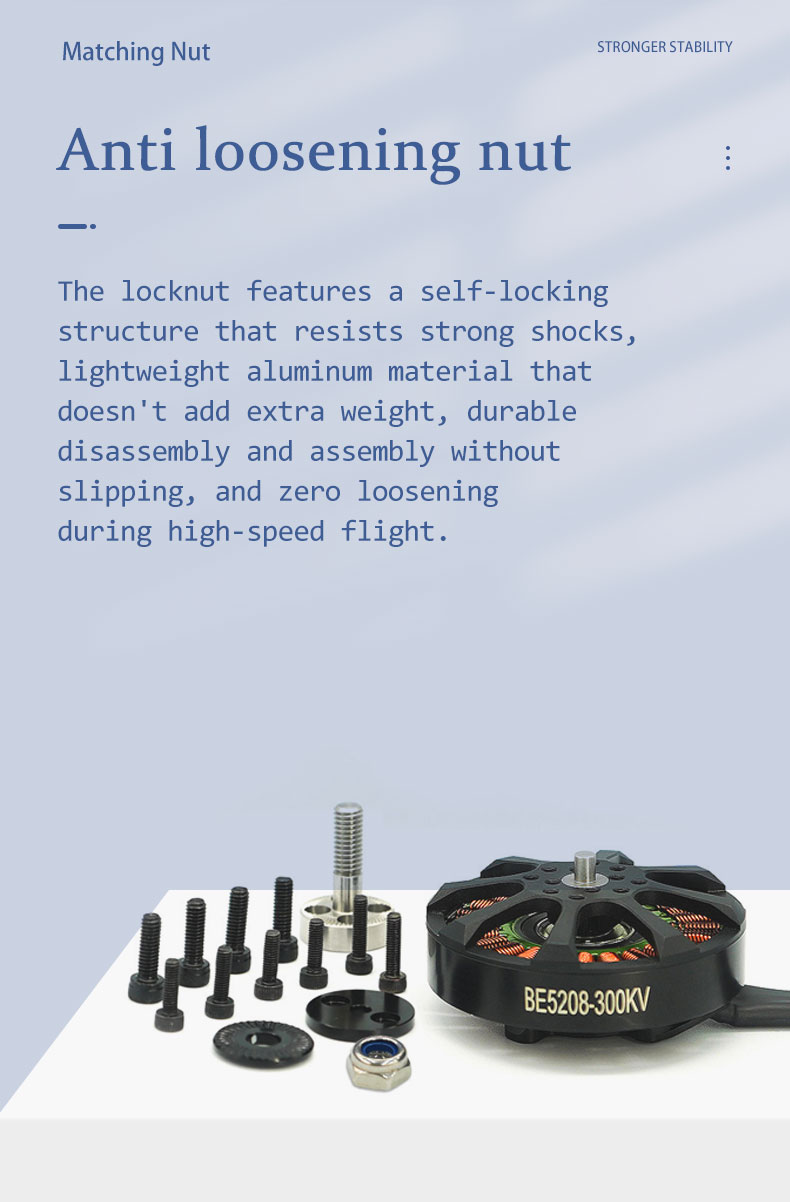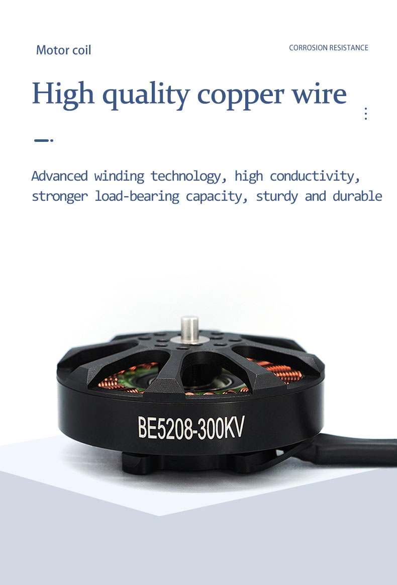 E-PowerRC BE5208 5208 300KV Brushless Motor 8S 15-18inch FPV Long Range Drone DlYPart-New Launch Large FPV Motor Parts item:BE5208(300KV) No.of cells: 8S Weight:183g W/0 Silicone Wire Bearing Shaft:8mm Max.Power (8S):1385W Lead:16#AWG200mm Motor Dimensions:59mm*31.46mm Idle Current (10V):1.2A Propeller:15"-18" Framework:24N22P Peak Current (8S):37A