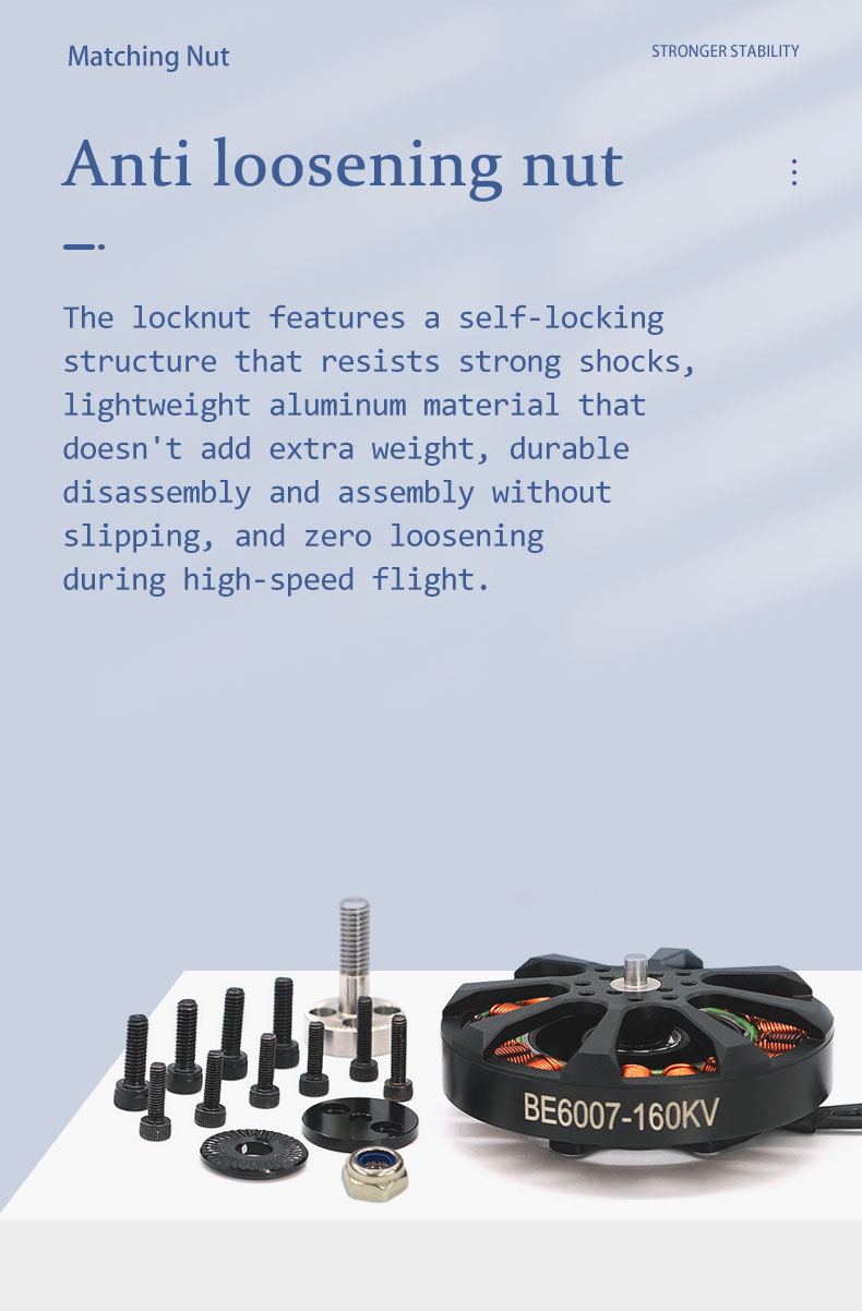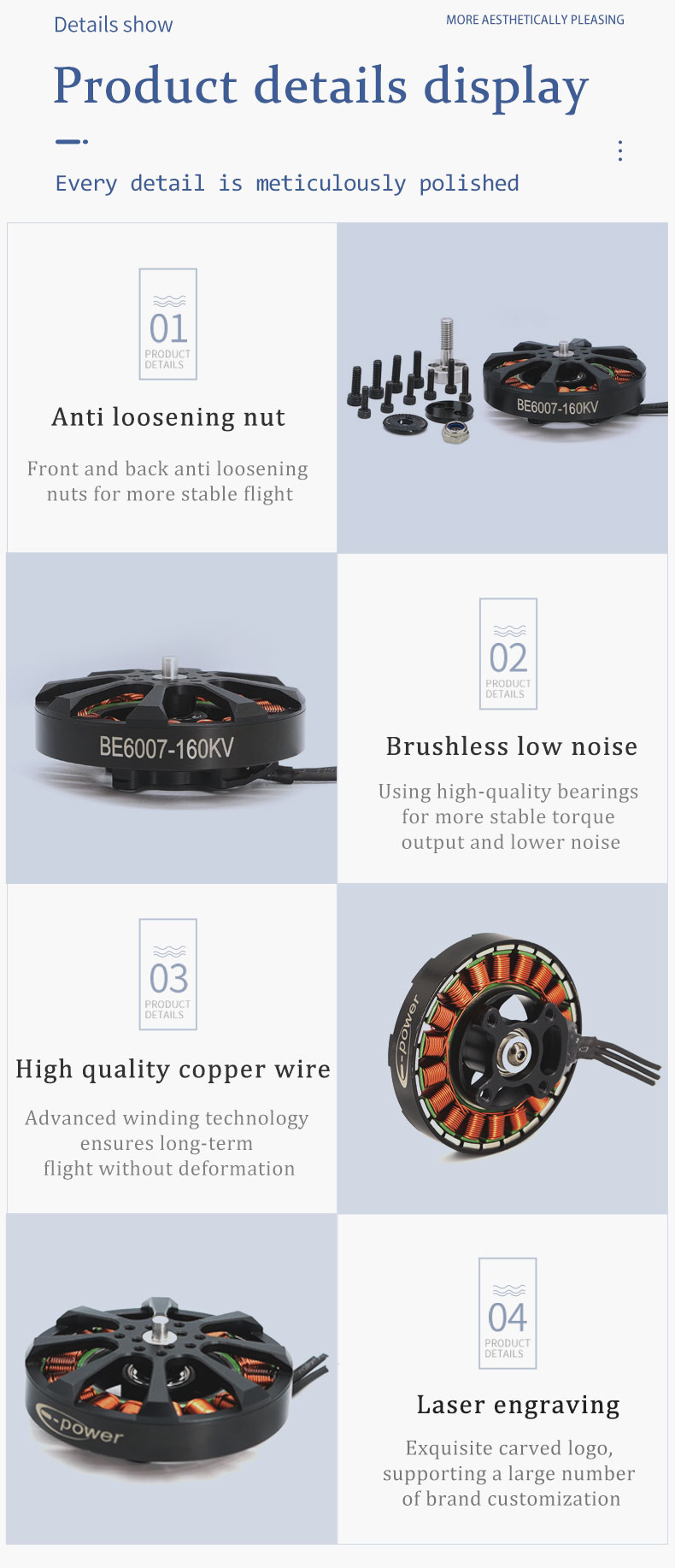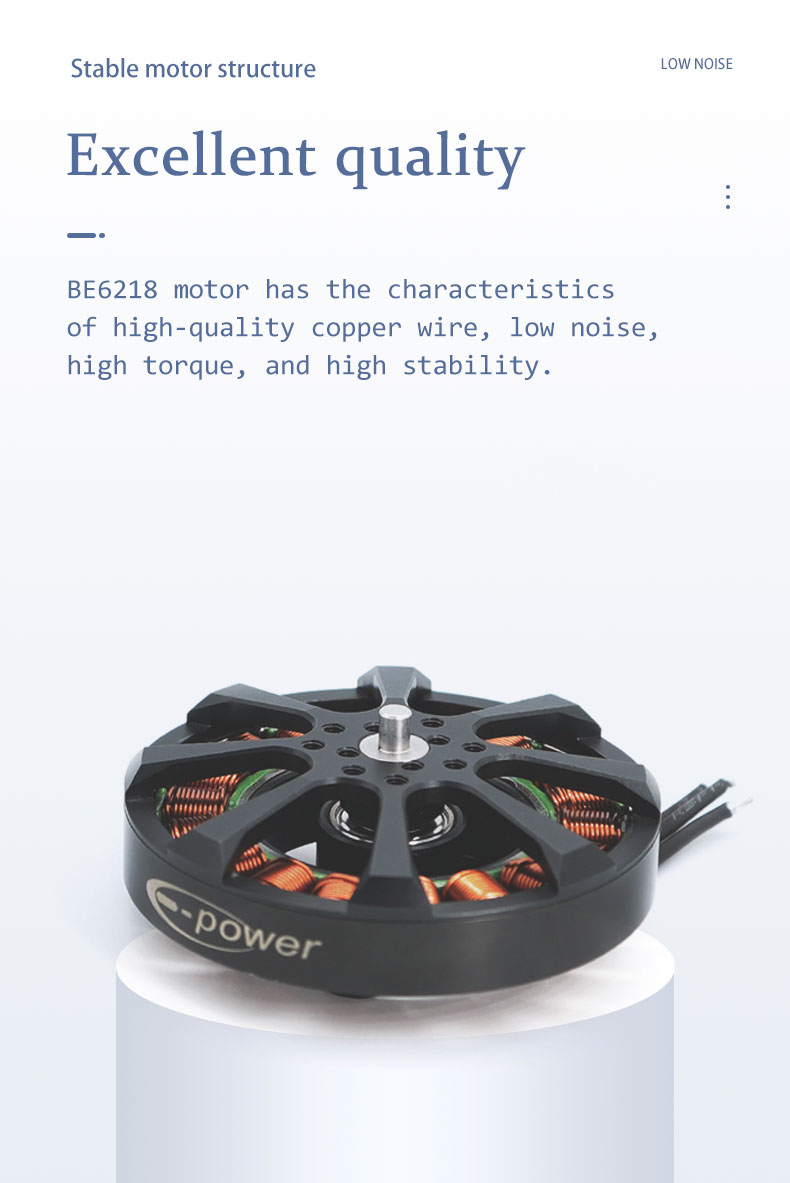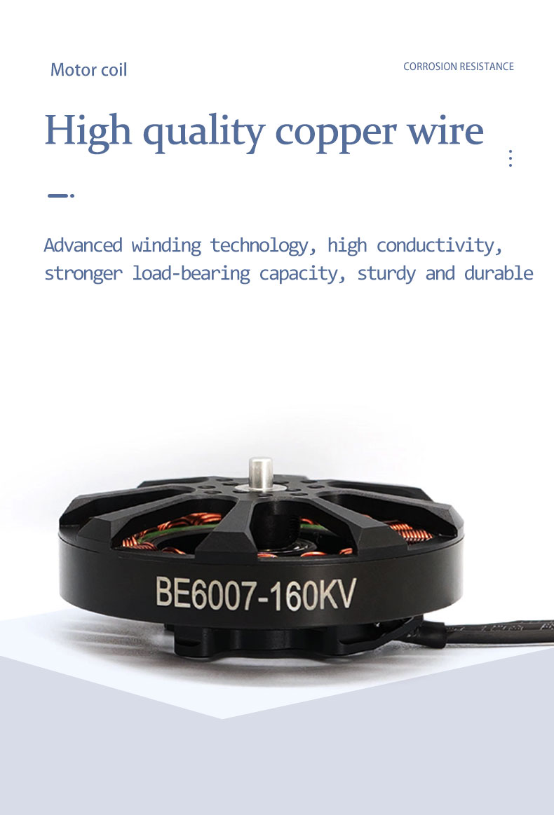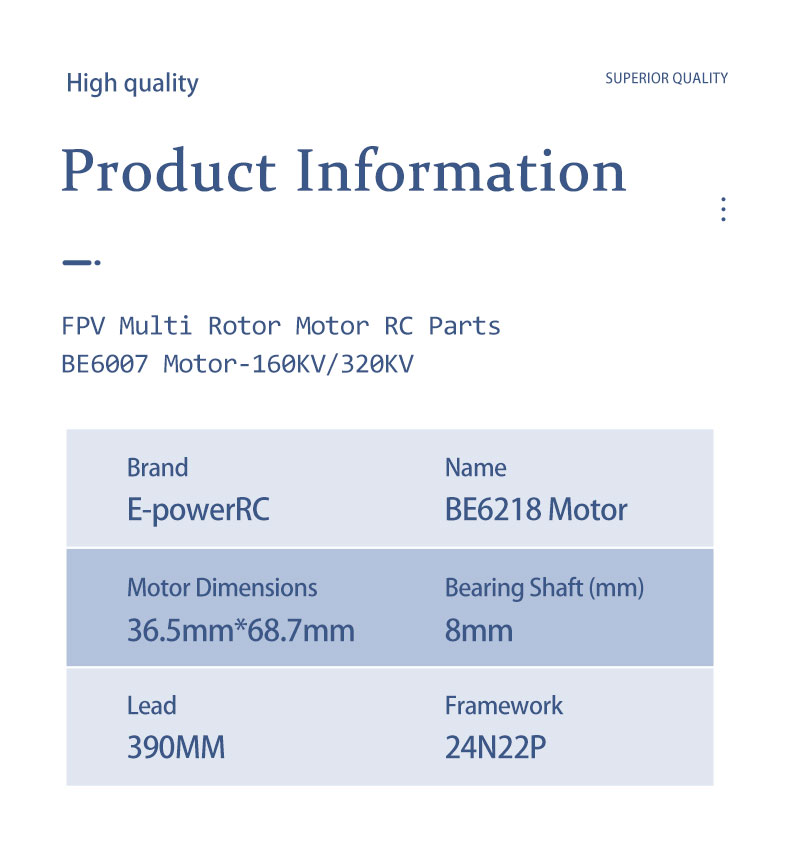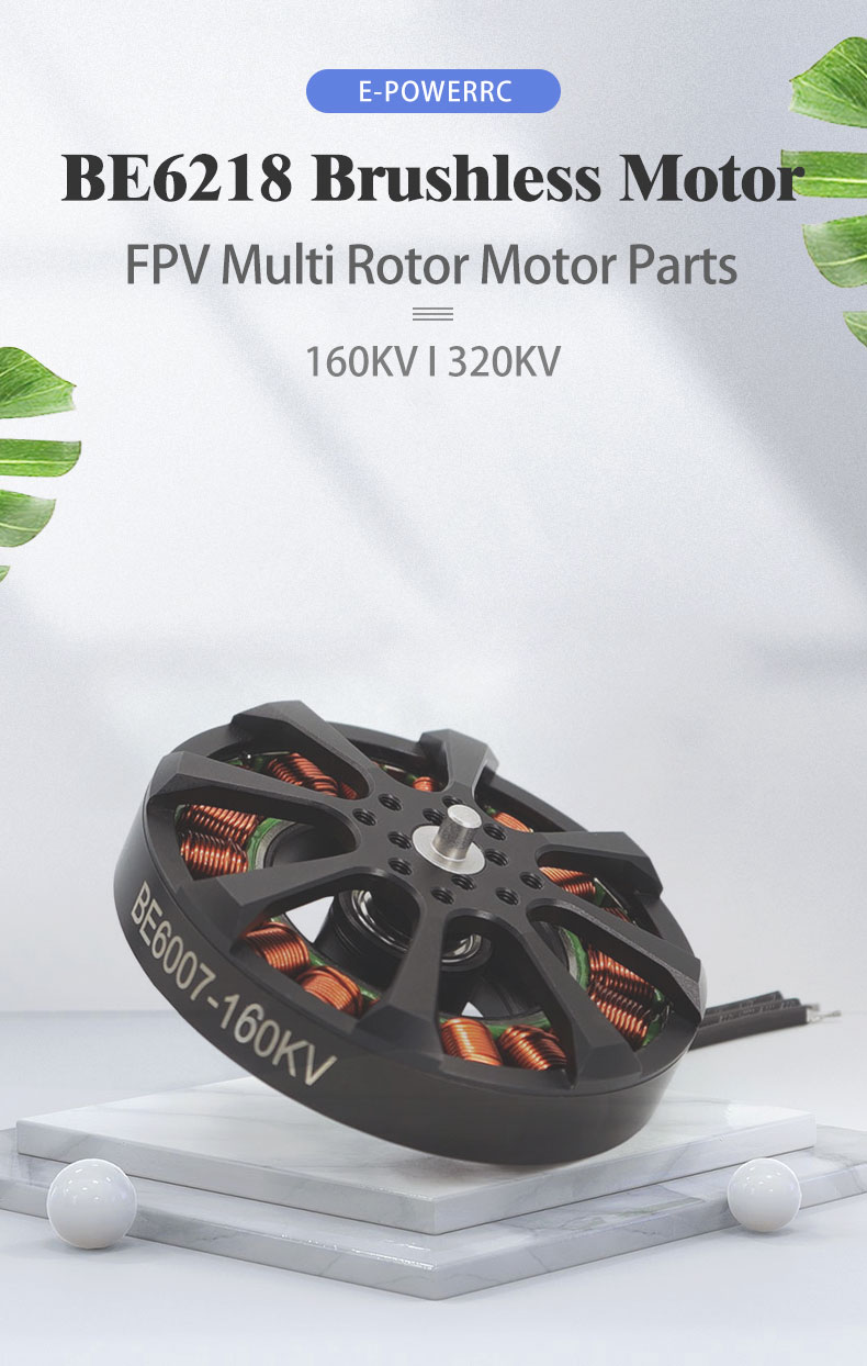 E-PowerRC BE6007 6007 160KV/320KV Brushless Motor 8S 18-22inch FPV Long Range Drone DlYPart-New Launch Large FPV Motor Parts item:BE6007(160KV) No.of cells: 8S Weight:167g W/0 Silicone Wire Bearing Shaft:8mm Max.Power (8S):1581W Lead:38mm Motor Dimensions:34.46mm*67mm Idle Current (10V):1.2A Propeller:18"-19" Framework:24N22P Peak Current (8S):33A