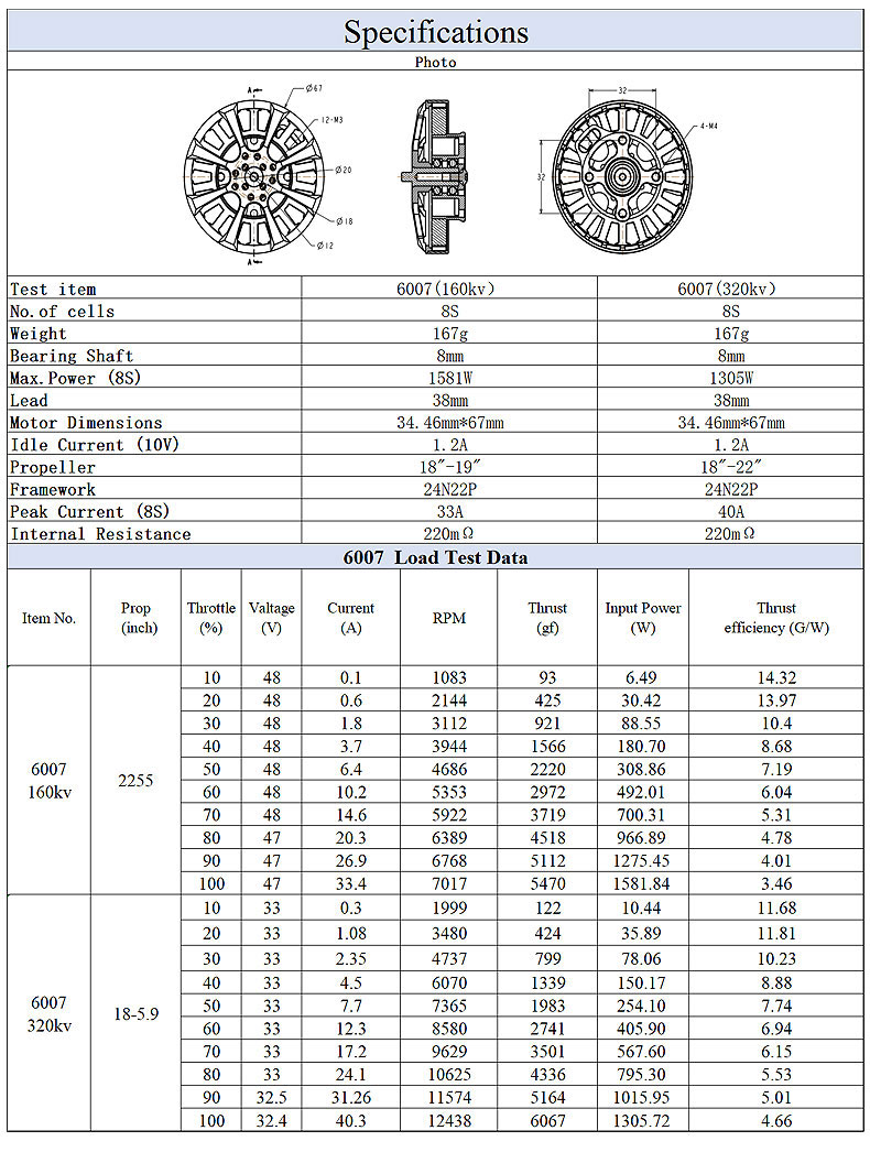 item:BE6007(320KV) No.of cells: 8S Weight:167g W/0 Silicone Wire Bearing Shaft:8mm Max.Power (8S):1305W Lead:38mm Motor Dimensions:34.46mm*67mm Idle Current (10V):1.2A Propeller:18"-22" Framework:24N22P Peak Current (8S):40A
