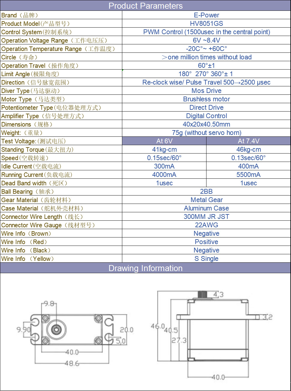 Standing Torque: 0.15sec/60°,41kg-cm-@6.00V ;0.13sec/60°,46kg-cm-@7.4V